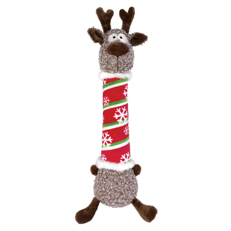 This long, skinny reindeer’s the ideal shape for thrashing fun—and sliding down chimneys of course! Low-tone squeaker prolongs play.