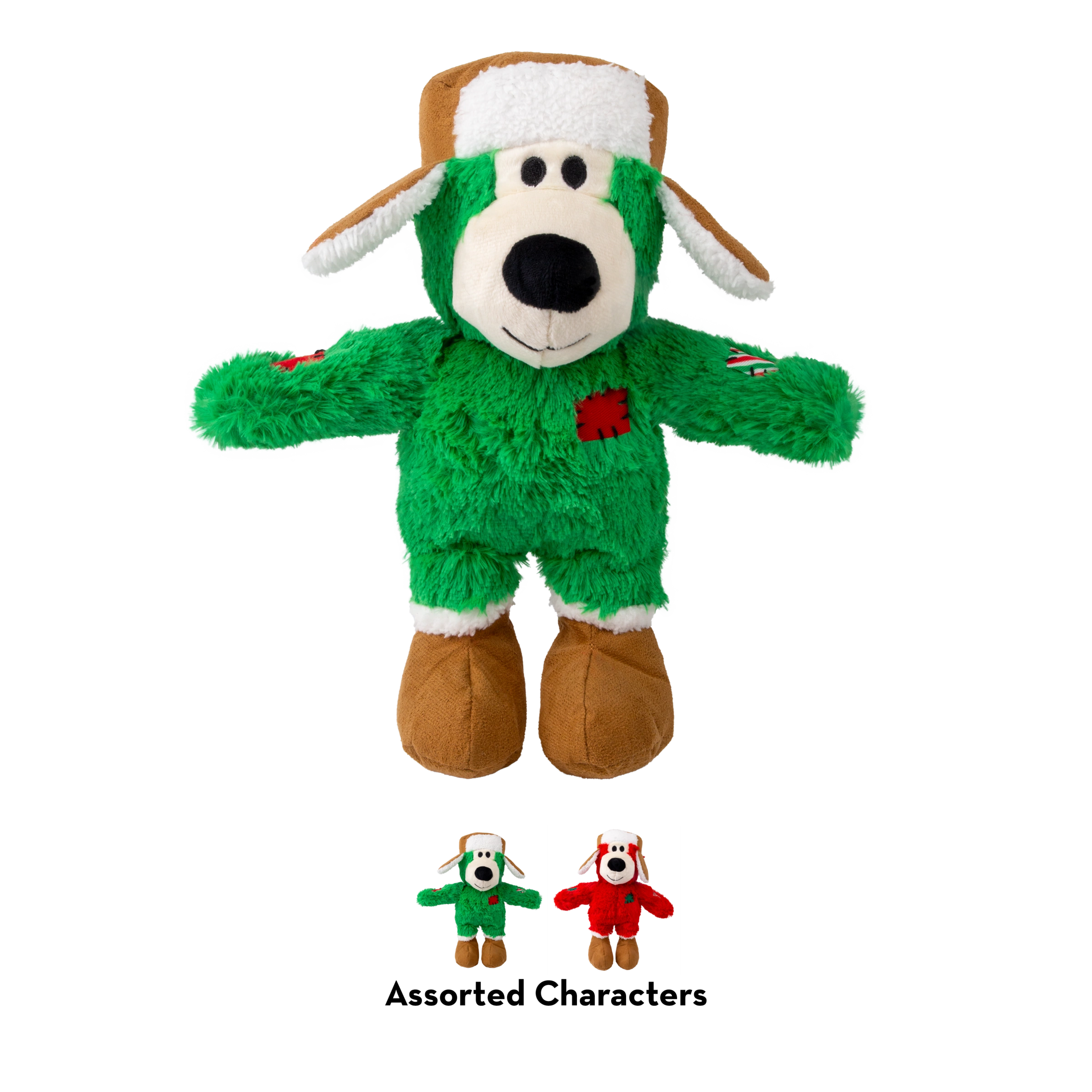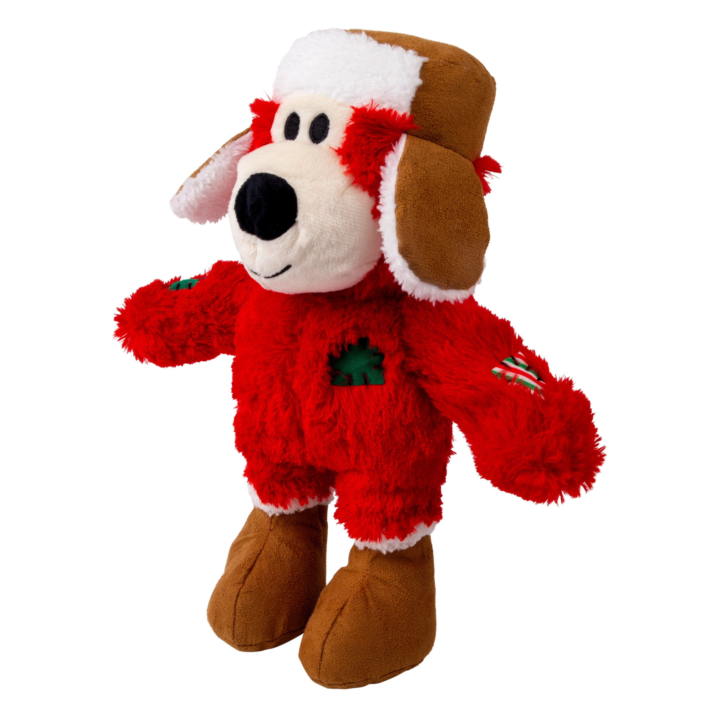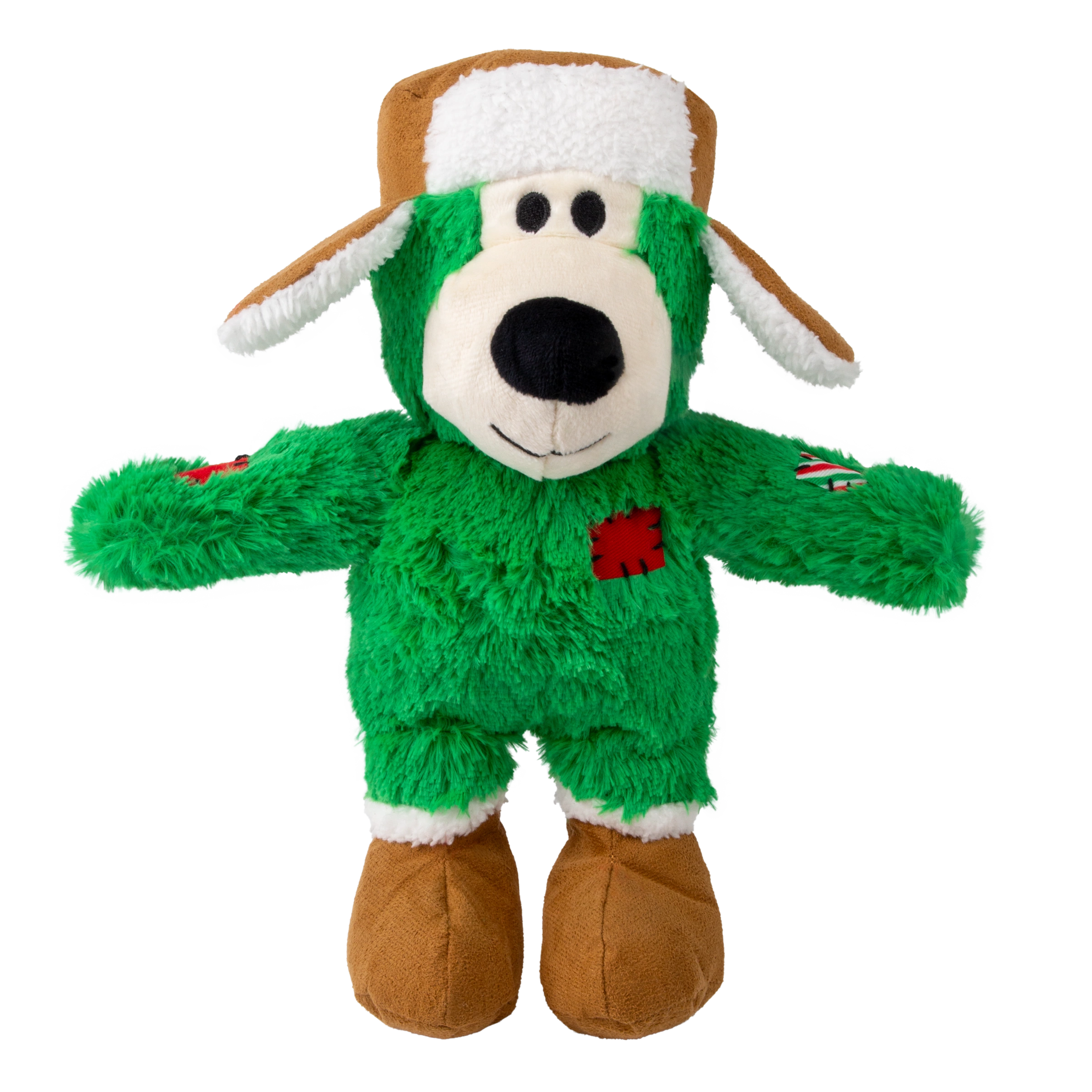 KONG Holiday Wild Knots Bear provides the perfect indoor play and snuggles on cold winter days. A winter sweater and scarf on the outside keep them warm, while an internal knotted rope, squeaker, and reinforced plush keep them durable on the inside. Less stuffing makes for less mess if things get too wild!