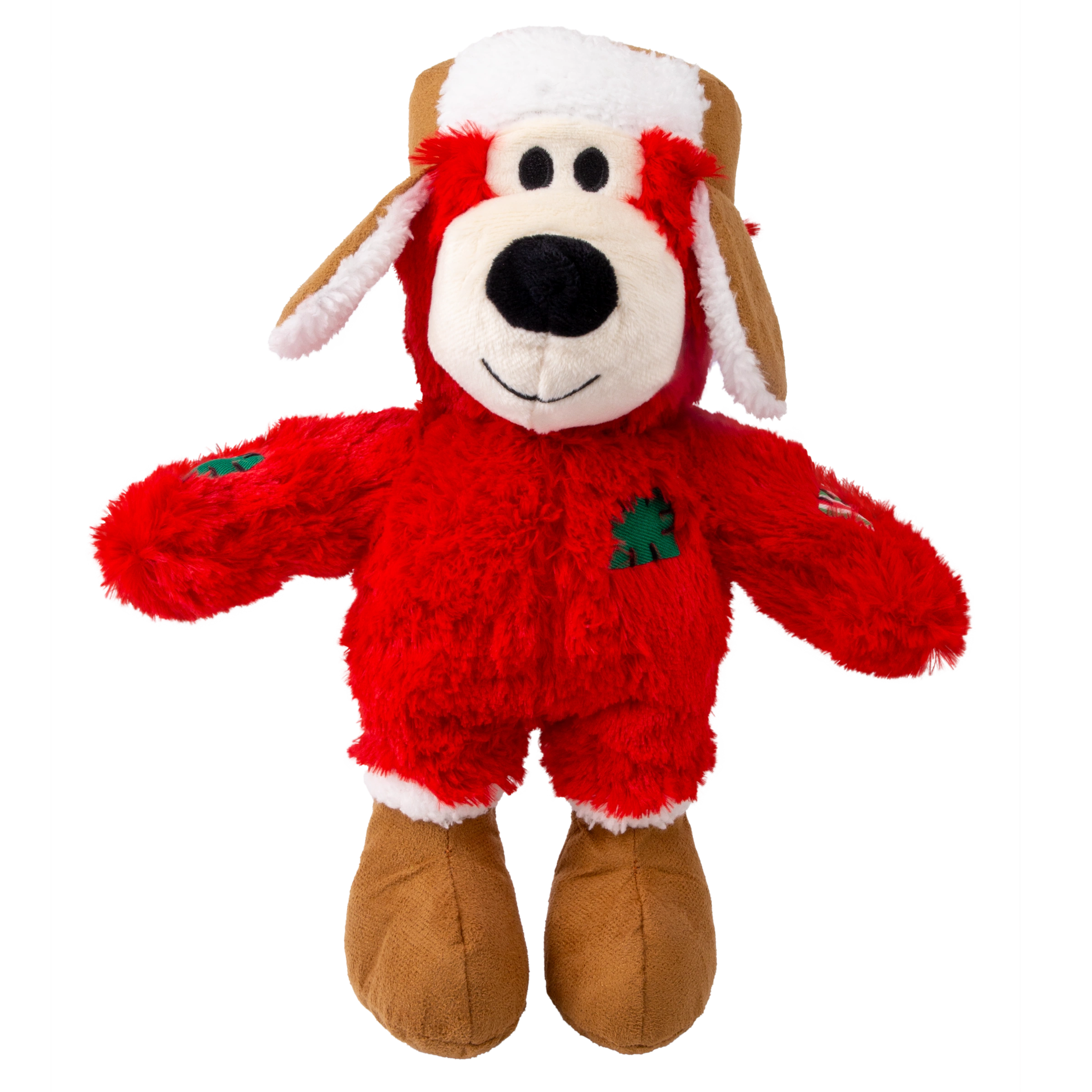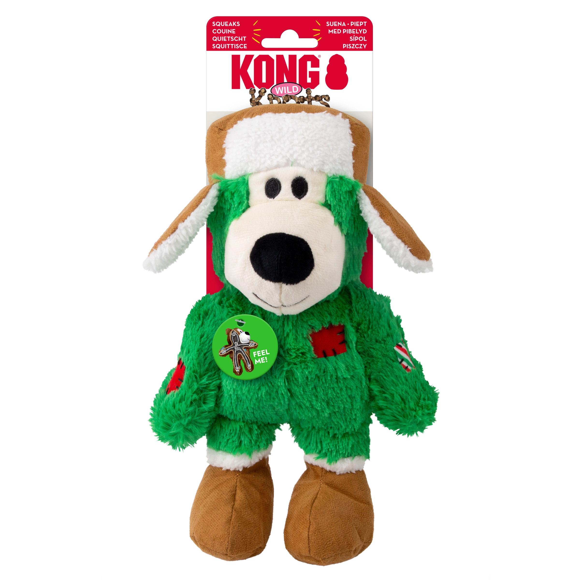 KONG Holiday Wild Knots Bear is soft and snuggly on the outside and tough on the inside thanks to an internal knotted rope skeleton that helps him last way longer than the holidays. The seasonal sweater and scarf are perfect for wintertime snuggles and indoor play. Chewing and tugging on this durable, adorable friend satisfies natural instincts while the squeaker prolongs play. Less stuffing makes for less mess if things get too wild!
