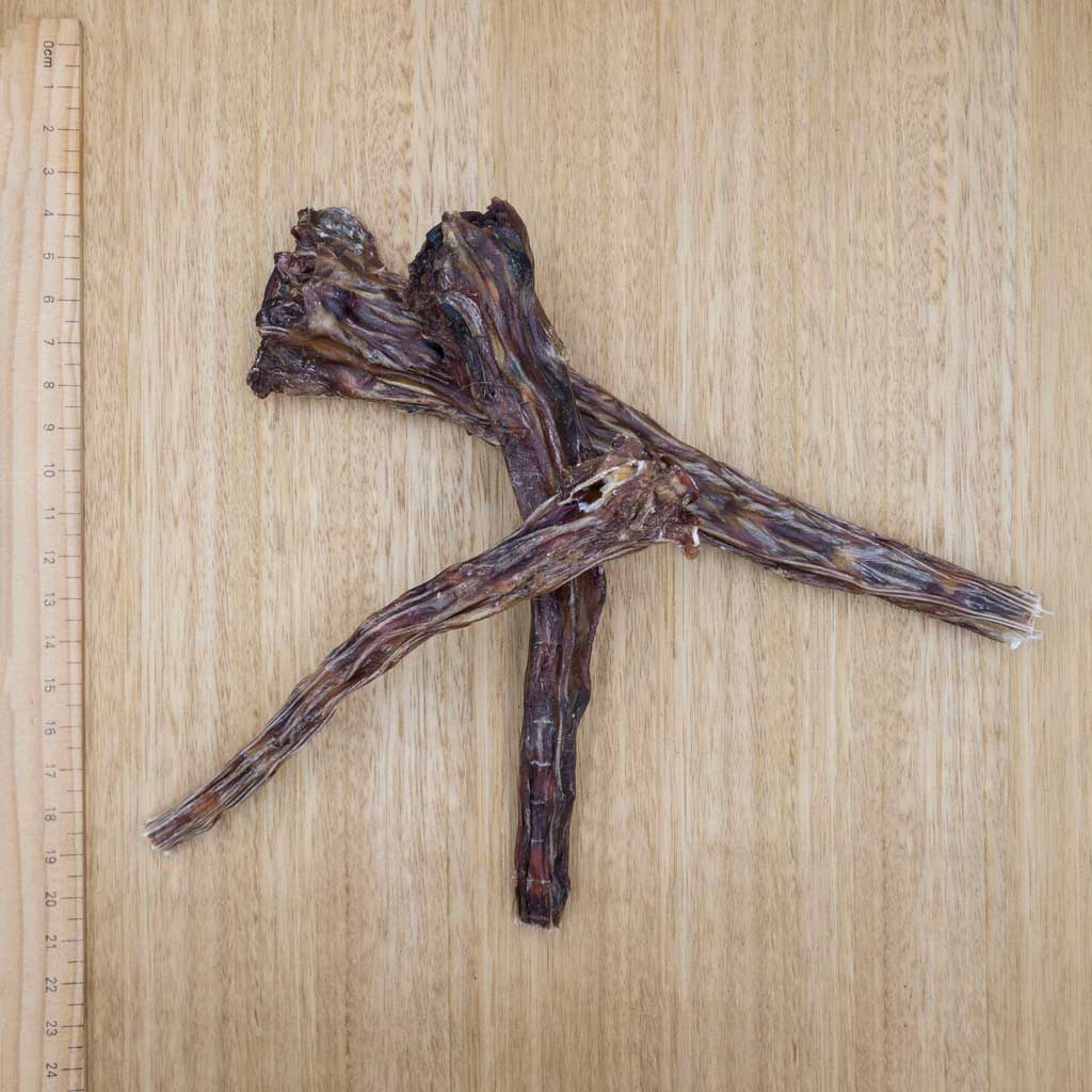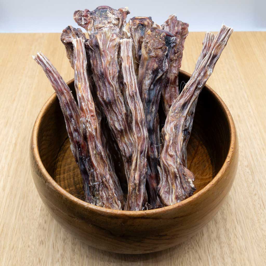 Moo tail ends are a longer treat, making them ideal for dogs that like to hold their treats while they eat.  They are great for teeth cleaning for smaller dogs, as the bones are covered with meat, so while your dog is trying to scrape the meat from the bones, they are scraping their teeth clean.  Most dogs will be able to eat the entire tail end in its entirety.  Suitable for all dogs of all ages.   You can expect a little mess when eaten, so better served outside.