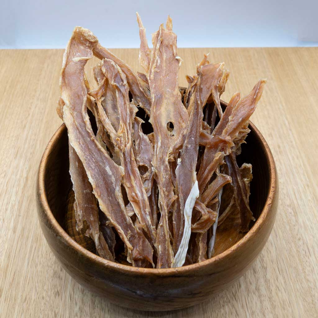 Our Shark jerky is made from shark muscle meat that has been sliced and dried.  This is a boneless, low in fat, crunchy treat.  Shark is known to be a good source of protein, omega-3 fatty acids, and chondroitin/glucosamine, which support joint health and reduce inflammation.  As such, it is known to help relieve symptoms of mild arthritis, including joint aches and pain.  It is also known to support the immune system, reduce inflammation and helps to maintain general health and wellbeing.  Suitable for all dogs of all ages.  A great inside treat as it is quick and easy to eat, so there is no time to leave crumbs behind.